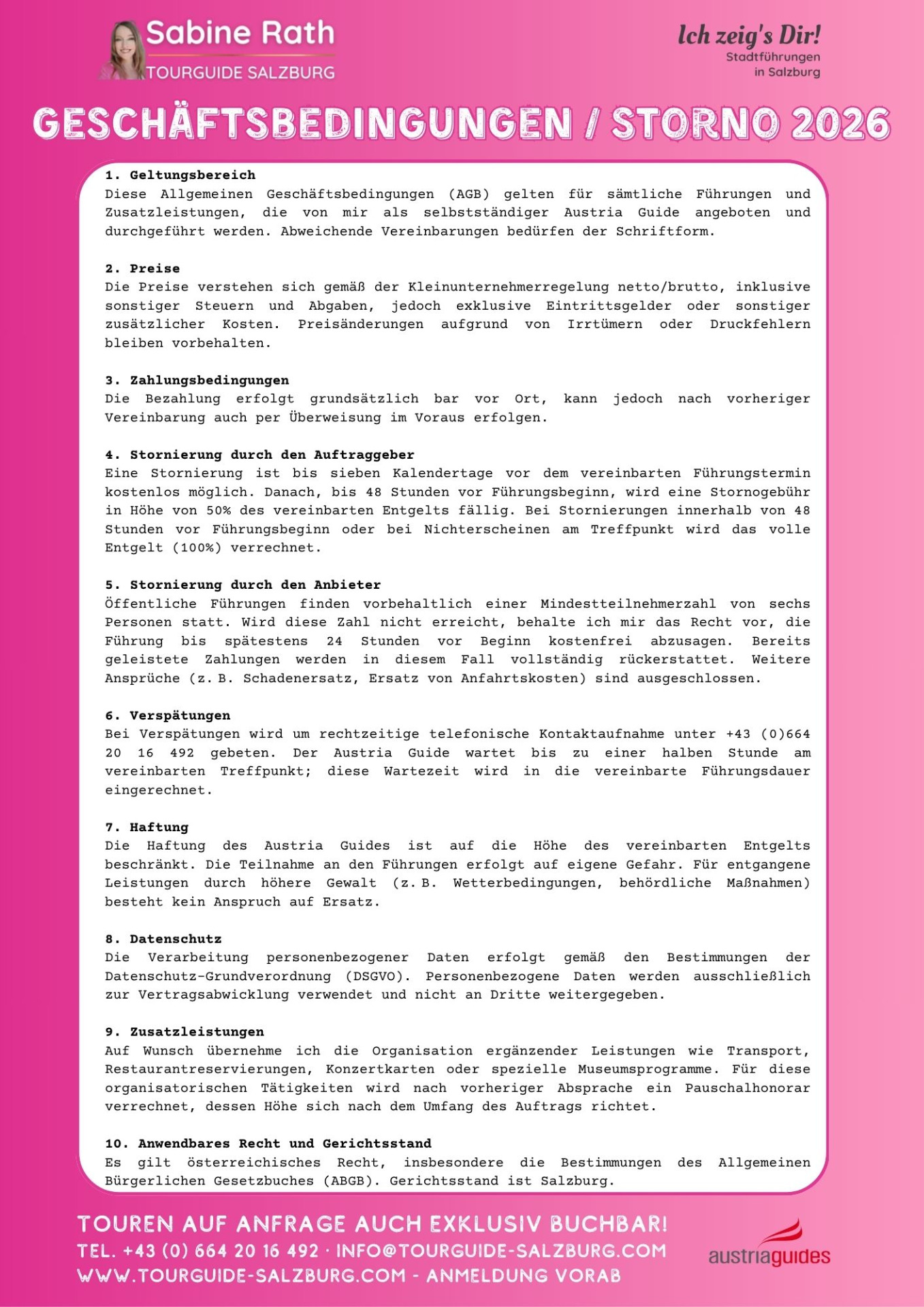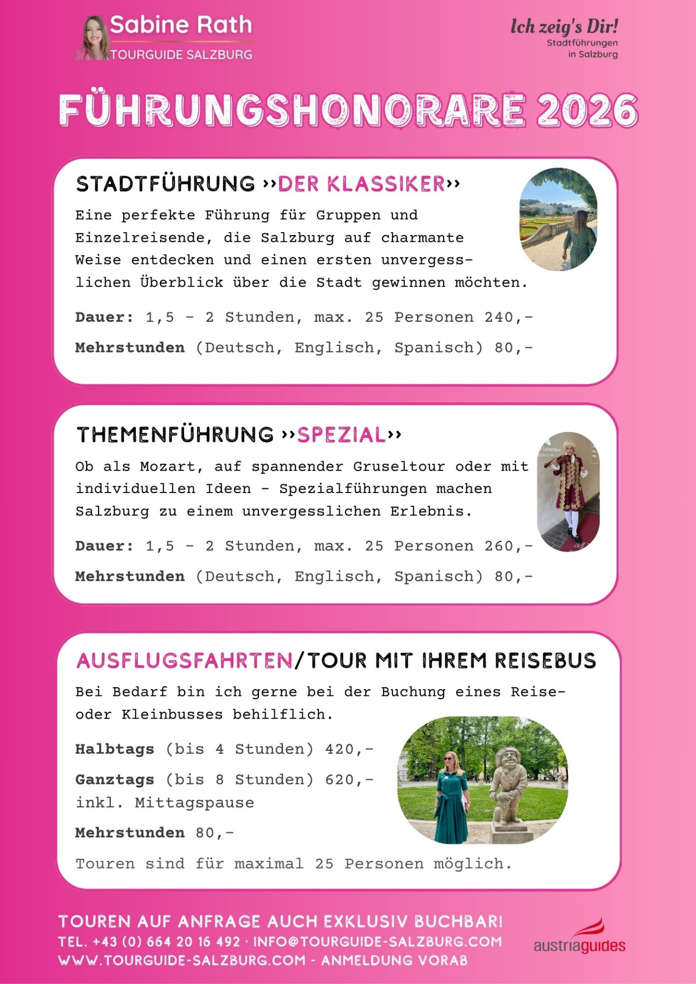 Hinweis: Bei allen Buchungen für meine öffentlichen Termine über GetYourGuide entstehen zusätzliche Kosten für mich. Eine Buchungsgebühr von €3,- per Person wird bei der Zahlung aufgerechnet. Um diese Gebühr zu vermeiden, empfehle ich die Direktbuchung bei mir: info@tourguide-salzburg.com